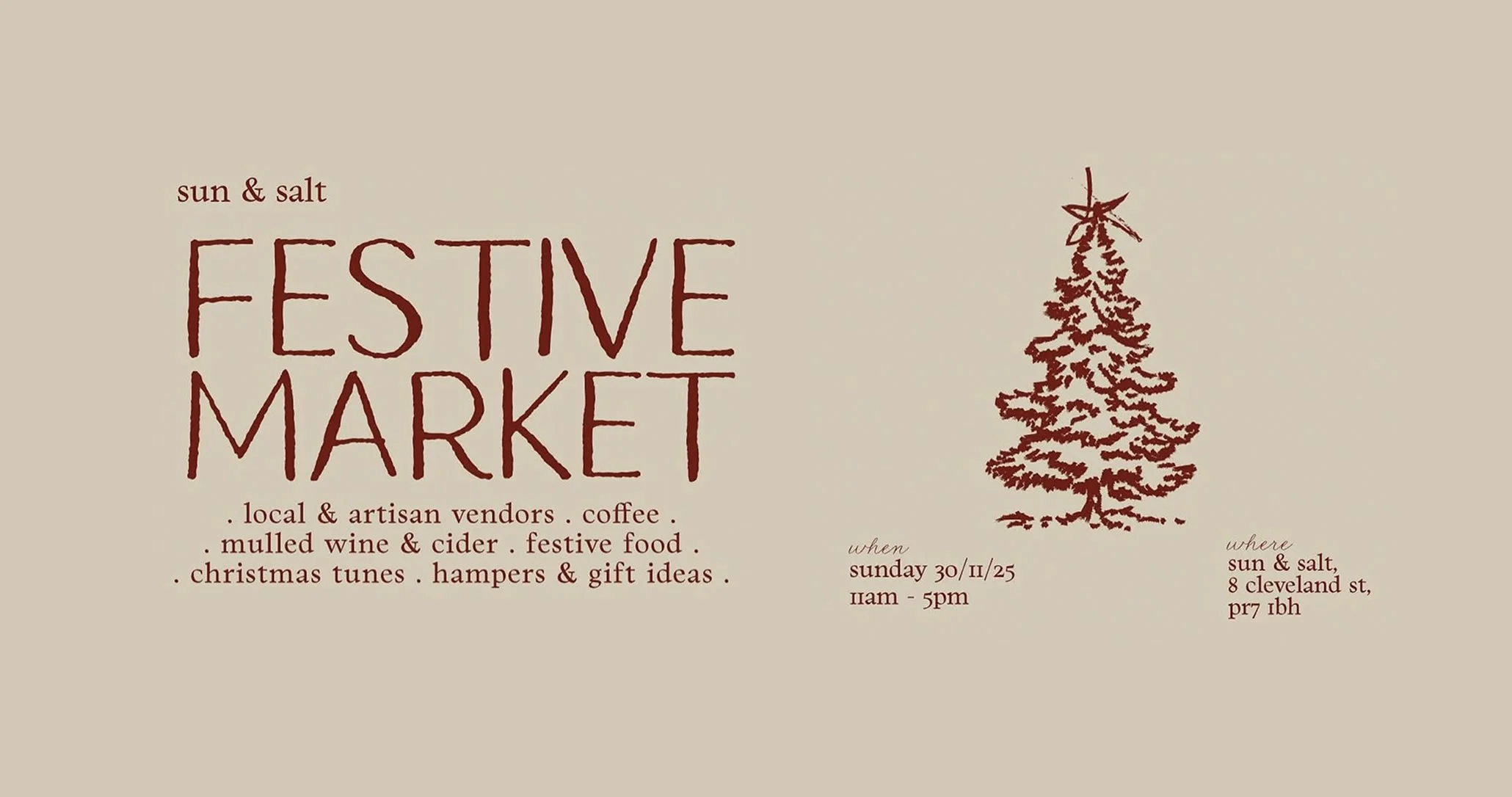 Sun & Salt is hosting a Festive Market Takeover this Sunday 30th November, bringing together eight brilliant local and independent makers who will be filling the dining rooms with gifts, stocking fillers and seasonal treats. Visitors will be able to browse a curated mix of handcrafted items while also discovering a selection of specially created hampers and foodie gifts from the Sun & Salt team.